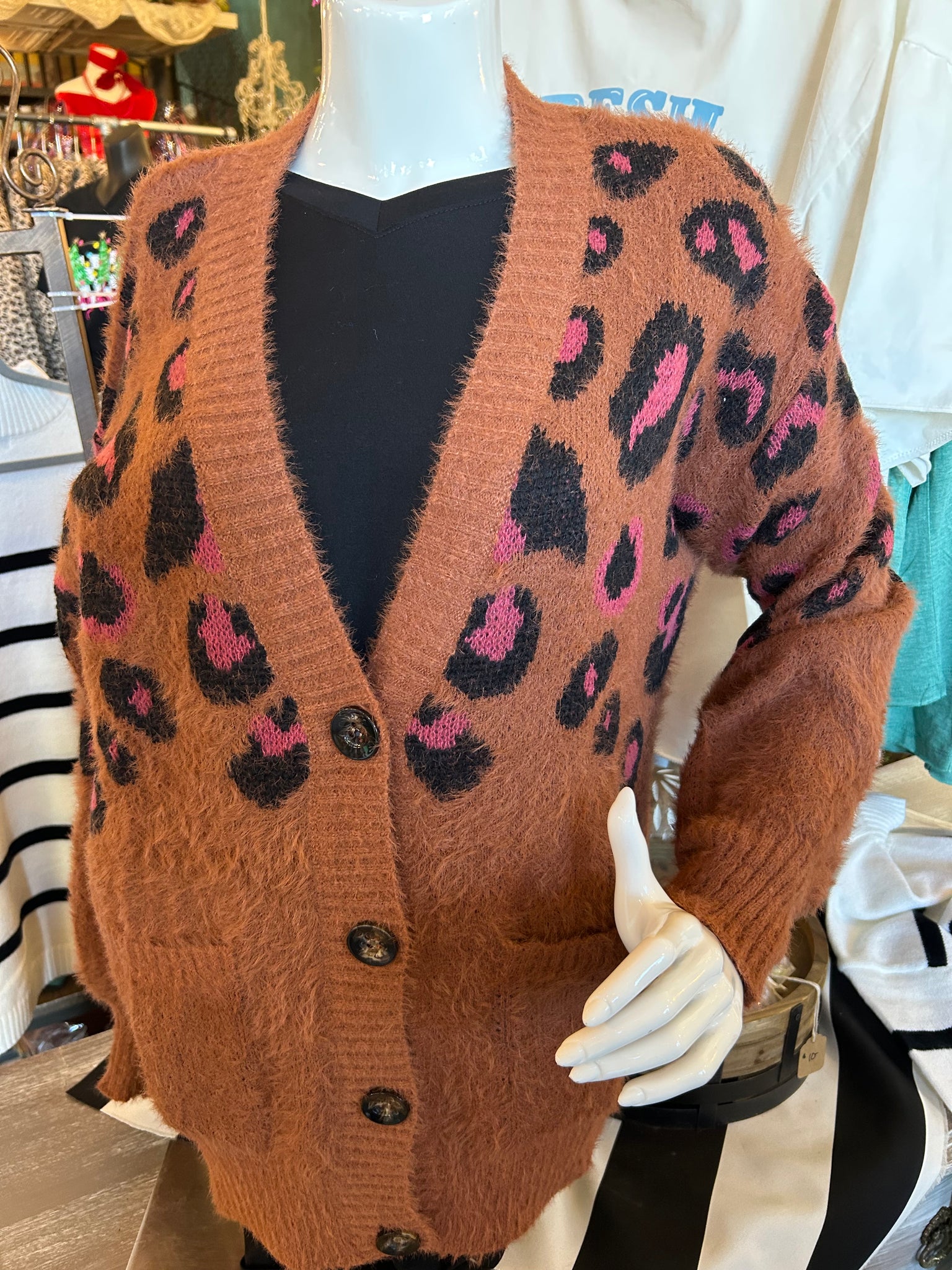 Cardigan Sweater: Brown/Leopard